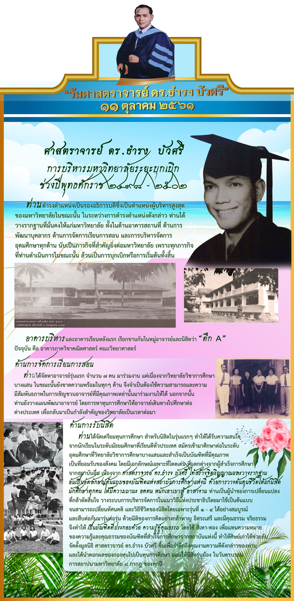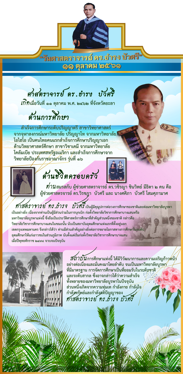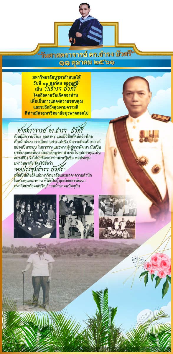 2561 thamrong22/10/201825/02/2025nkunphisit « ‹ of 2 › » วันศาสตราจารย์ ดร.ธำรง บัวศรี ประจำปี 2561ผู้บุกเบิกก่อตั้งมหาวิทยาลัยบูรพา